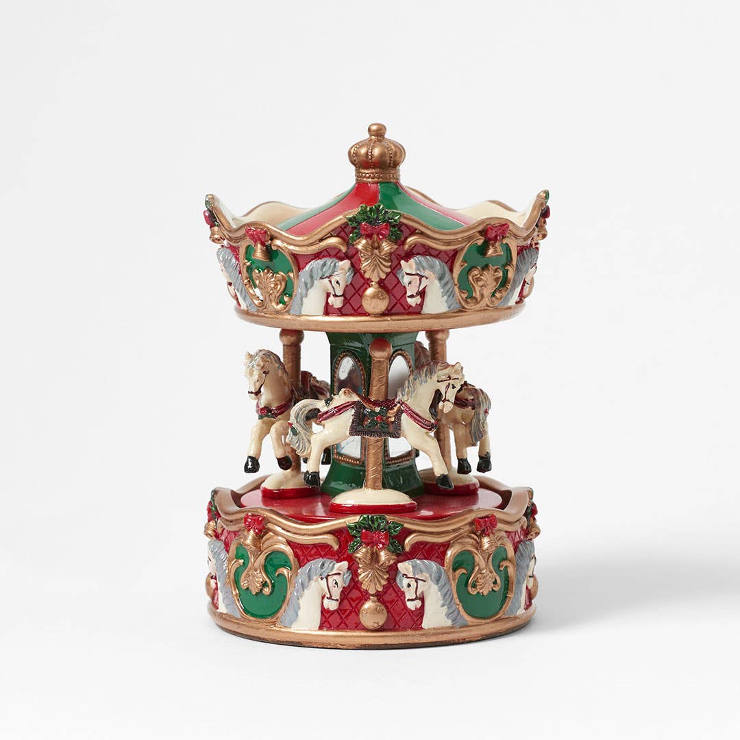 This festive merry-go-round plays charming music while adding vintage style to your decor. With its rich red, gold, and green colours, it brings joy and nostalgia to any setting.