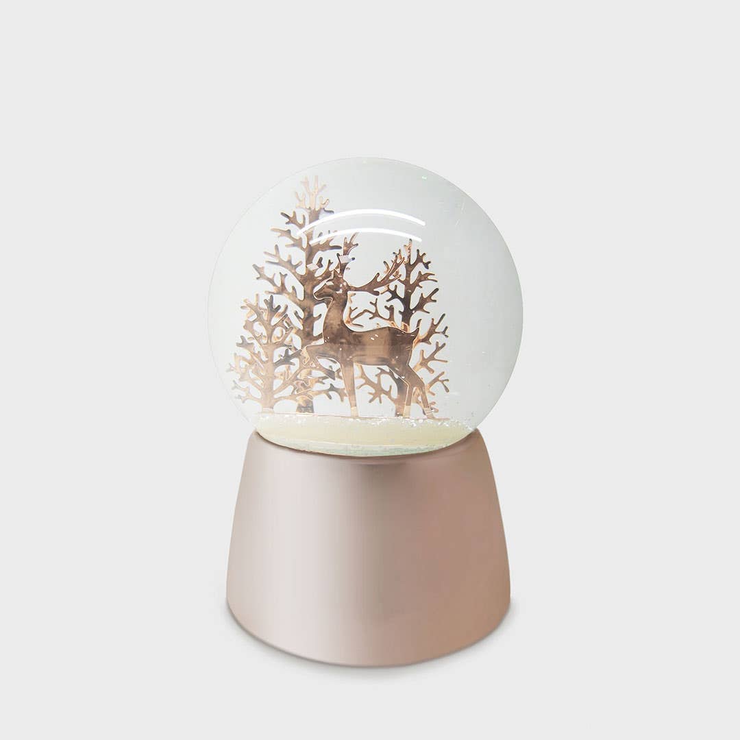 This rose gold snow dome with a forest reindeer scene captures the beauty of winter in a charming design. Playing a gentle melody, it brings warmth and elegance to any decor.