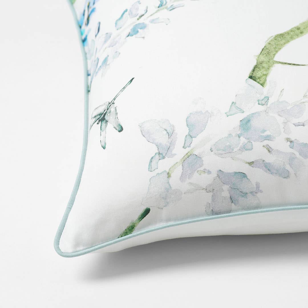 Printed on luxurious 360 thread count cotton sateen, the quilt cover features hummingbirds and dragonflies fluttering around blooming wisteria.